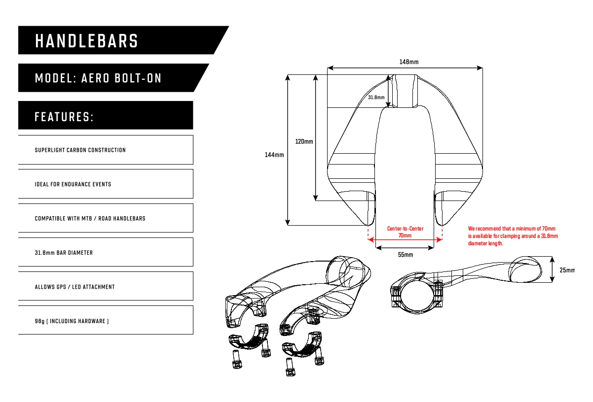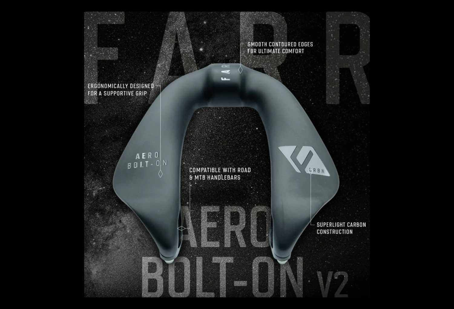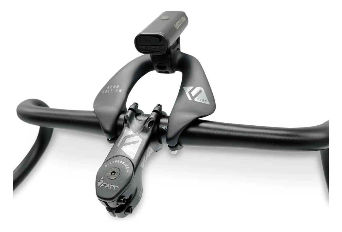 The Farr Carbon Aero Bolt-On V2 is the new V2 version with updated finish and graphics. Allows for additional hand positions on long rides as well as creating an aero-tuck position should you wish to power along on the flats. Made for Aero MTB or Comfort Gravel. Sizing is similar to most popular GPS/Powermeter attachments and does not protrude excessively in any way. Simple, bolt-on design that can be fitted to all 31.8 mm handlebars within minutes. (Note: only needs 2.5~3 Nm to tighten on the handlebars).