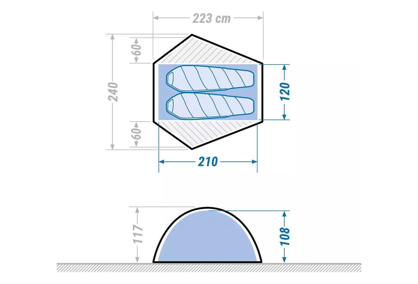 - Two lateral apses (storage space between the bedroom and the flysheet), 60 cm deep, can each accommodate a backpack of around 50 70 liters, mountain equipment and a pair of hiking shoes.