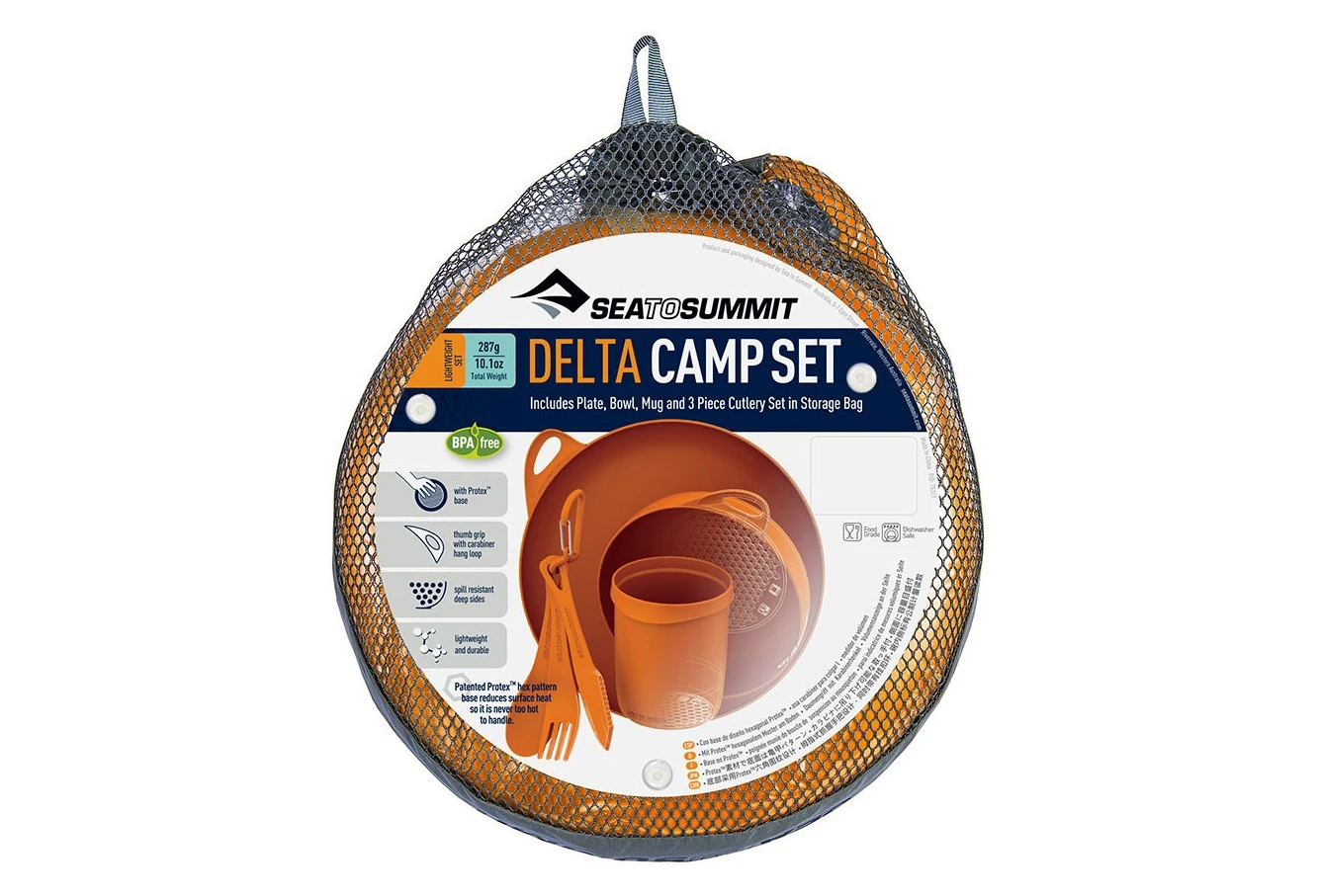 Set including the necessary utensils for an outdoor meal. Composed of 1 plate + 1 bowl + 1 mug + 1 cutlery set (fork, knife, spoon).