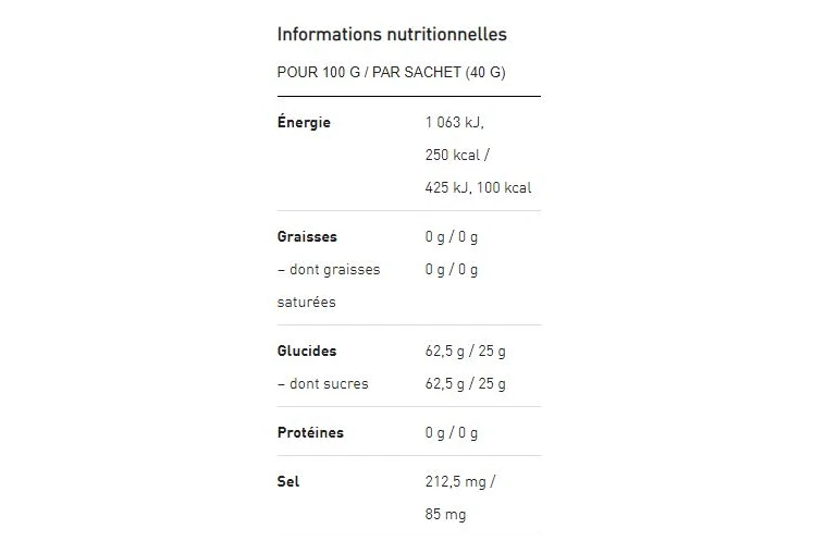 ENERGY QUANTITY Studies have shown that our bodies can use up to 90 grams of carbohydrates per hour. Researchers have recently shown that a fructose to glucose ratio of 0.8:1 allows for an even greater intake of up to 100 grams per hour. GEL 100 is based on this ratio and contains a large amount of energy. One bag contains 25 grams of carbohydrates.