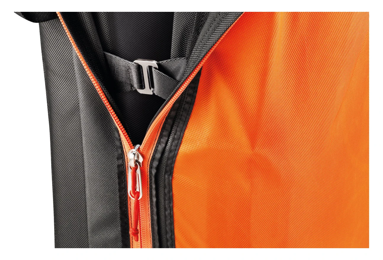 - Practical folding system and closure with zipped flap providing ample storage space during transport.
